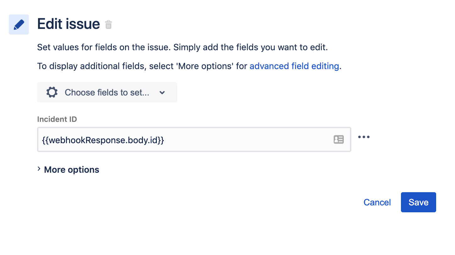 The Edit Issue action extracts the Incident ID from the Statuspage request and stores it in a Incident ID custom field. The Incident ID is extracted using smart values. The following screenshot demonstrates how to configure this Edit Issue component.